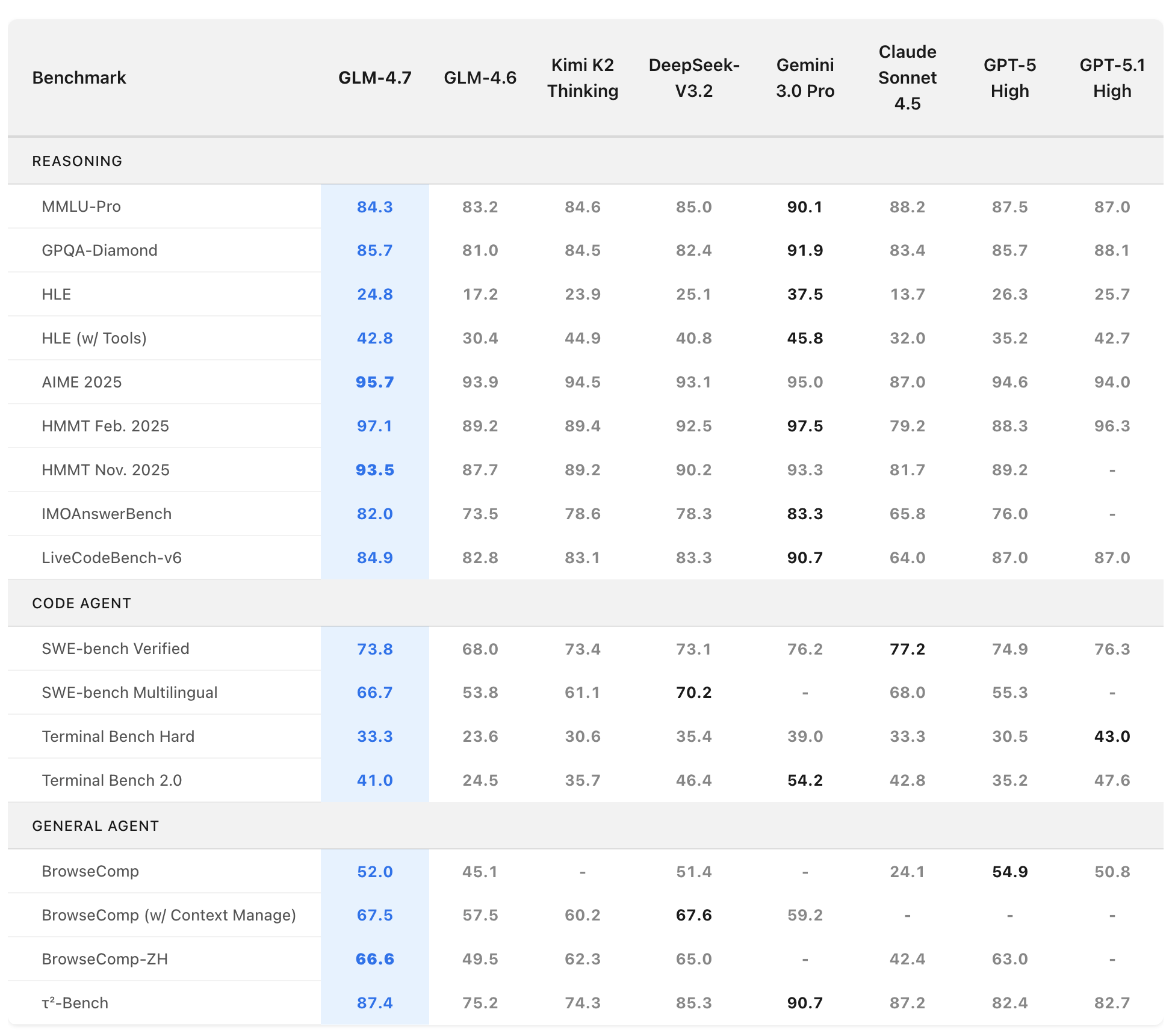 Benchmark Performance. More detailed comparisons of GLM-4.7 with other models GPT-5, GPT-5.1-High, Claude Sonnet 4.5, Gemini 3.0 Pro, DeepSeek-V3.2, Kimi K2 Thinking, on 17 benchmarks (including 8 reasoning, 5 coding, and 3 agents benchmarks) can be seen in the below table.
